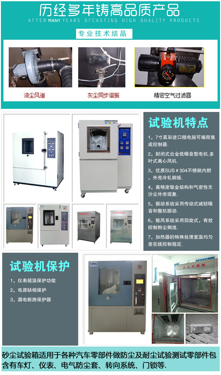 | 產(chǎn)品用途:砂塵試驗(yàn)箱適用于各種汽車零部件做防塵及耐塵試驗(yàn),測(cè)試零部件包含有車燈、儀表、電氣防塵套、轉(zhuǎn)向系統(tǒng)、門鎖等。 | |