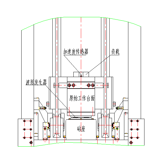 設(shè)備工作時(shí),是由提升機(jī)構(gòu)將工作臺(tái)面沿導(dǎo)向軸提升到一定高度后,臺(tái)面就具有一定的重力勢(shì)能,同時(shí)該設(shè)備還配有四根高強(qiáng)度的彈力繩,當(dāng)臺(tái)面提升時(shí),彈力繩也被拉伸具有彈性能。當(dāng)臺(tái)面到達(dá)指定的位置后,抱閘鎖緊機(jī)構(gòu)工作,將臺(tái)面牢牢的鎖死在導(dǎo)向軸上,提升機(jī)構(gòu)下落,當(dāng)提升機(jī)構(gòu)到達(dá)初始的最低位置后,檢測開關(guān)發(fā)出指令,控制器得到指令后就讓計(jì)算機(jī)控制界面的跌落按鈕變亮,在點(diǎn)擊跌落命令后,鎖緊機(jī)構(gòu)打開,靜止的臺(tái)面在重力勢(shì)能和彈力繩彈性能的作用下加速向下運(yùn)動(dòng),當(dāng)運(yùn)動(dòng)的臺(tái)面撞擊到臺(tái)體砧座上安放的波形發(fā)生器后,就會(huì)產(chǎn)生一個(gè)沖擊脈沖,測量系統(tǒng)撲捉并顯示這一沖擊脈沖的波形、脈沖峰值加速度、脈沖的持續(xù)時(shí)間等參數(shù),我們就從顯示的數(shù)據(jù)上知道了這次臺(tái)面沖擊時(shí)獲得的脈沖峰值加速度、脈沖持續(xù)時(shí)間、脈沖波形的失真情況。臺(tái)面在沖擊后會(huì)沿導(dǎo)向軸向上反彈,為防止工作臺(tái)面二次和波形發(fā)生器撞擊,產(chǎn)生二次碰撞沖擊脈沖,鎖緊機(jī)構(gòu)會(huì)在工作臺(tái)面反彈后鎖緊臺(tái)面在某一高度。臺(tái)面和波形發(fā)生器撞擊瞬間產(chǎn)生的沖擊能量將由臺(tái)體底部安裝的空氣彈簧以及阻尼器來運(yùn)動(dòng)吸收,有效降低沖擊能量對(duì)周圍環(huán)境的影響。調(diào)整波形發(fā)生器的硬度、厚度就可改變沖擊脈沖波形的持續(xù)時(shí)間,改變工作臺(tái)面的提升高度,就可改變沖擊脈沖峰值加速度的大小。
