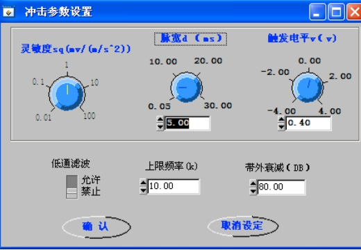 2到最大的脈沖加速度15000g,如果選用一個(gè)加速度傳感器,在保證最大測量范圍的前提下,傳感器的靈敏度都很高,在小量級(jí)測試時(shí),由于輸出電量很低,難以采集到?jīng)_擊脈沖波形。因此,設(shè)備專門配備了兩只型號(hào)的加速度傳感器,一只是最大量程只到30000m/s