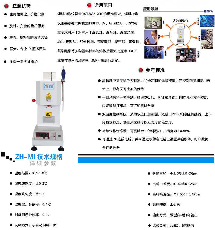| 產(chǎn)品特點:1、高精度中英文彩色控制器,特殊定制的薄膜按鍵,在控制精度和使用壽命上,都有無可比擬的優(yōu)勢 2、手自動切料一體控制,精確到0.1s,可任意設(shè)置切料時間和切料次數(shù)。 3、內(nèi)置微型打印機,可打印測試數(shù)據(jù) 4、雙溫度控制系統(tǒng),采用雙進(jìn)口加熱圈,雙進(jìn)口PT100鉑電阻傳感器,上下段獨立控溫,提高測試精度以及溫度的穩(wěn)定度。 | |